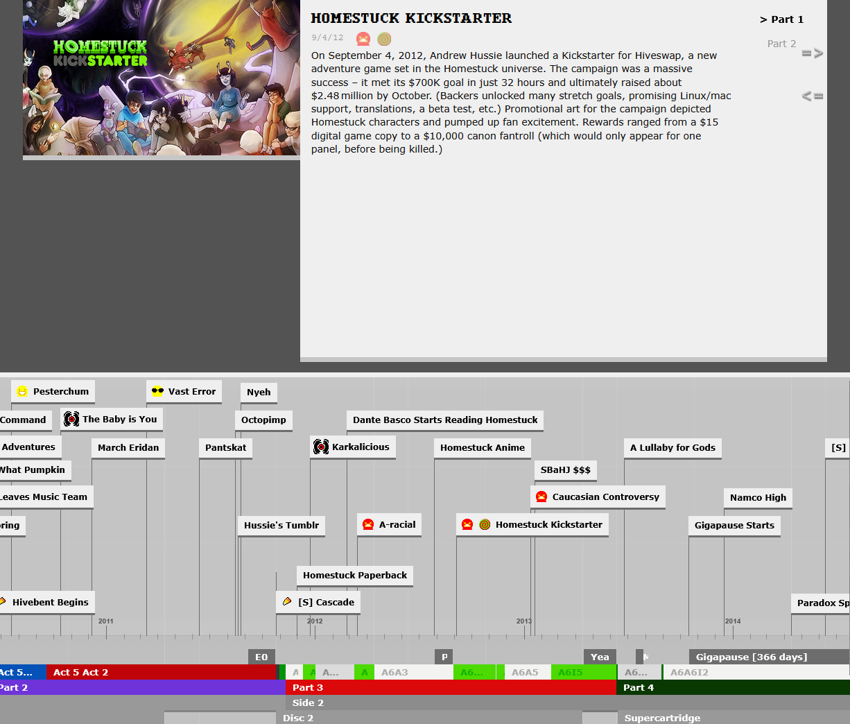 ViewA collection of 2013 metrics of the Homestuck webcomic. Similar to ReadMSPA, but with some stats not found anywhere else, like complexity per page.