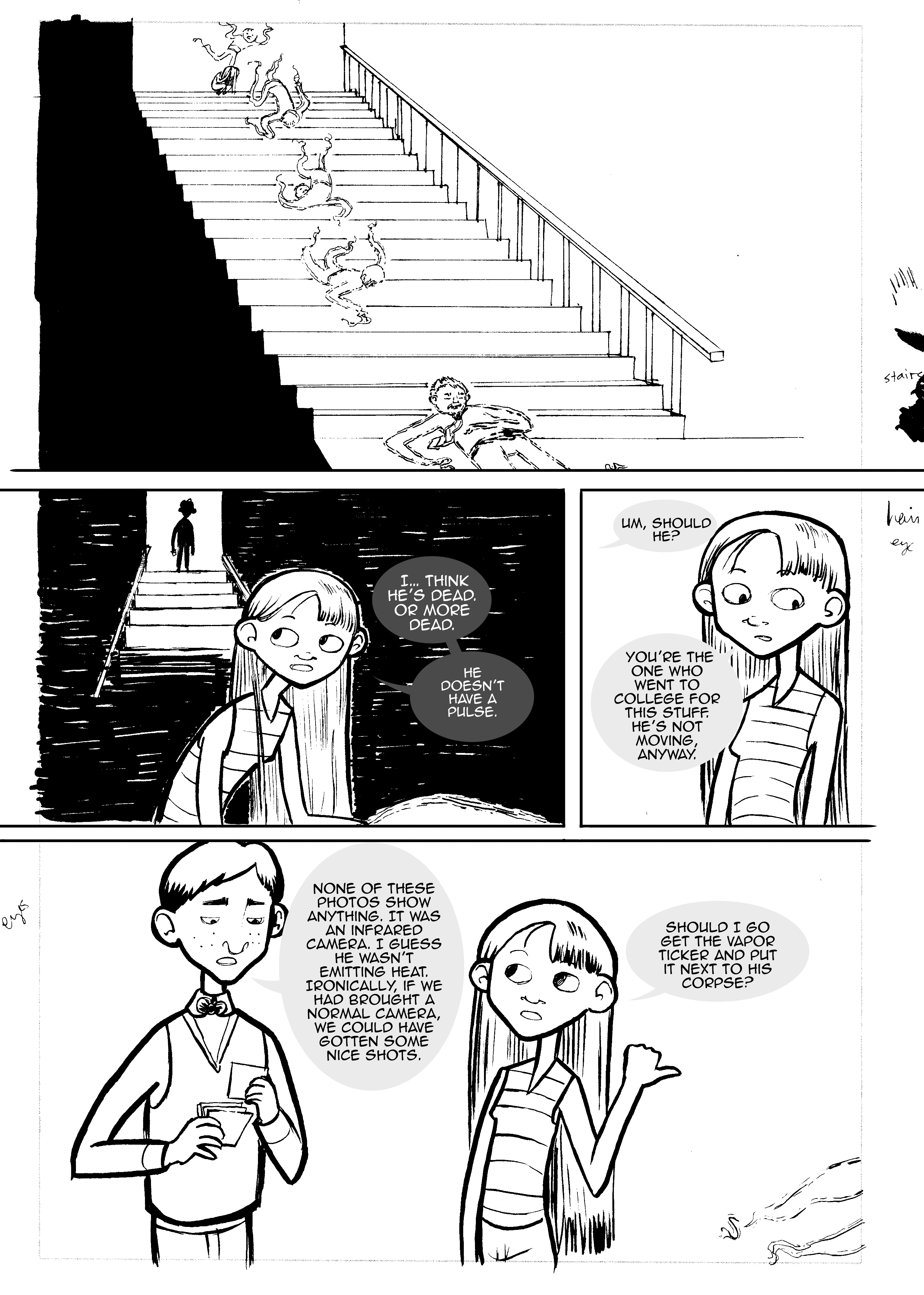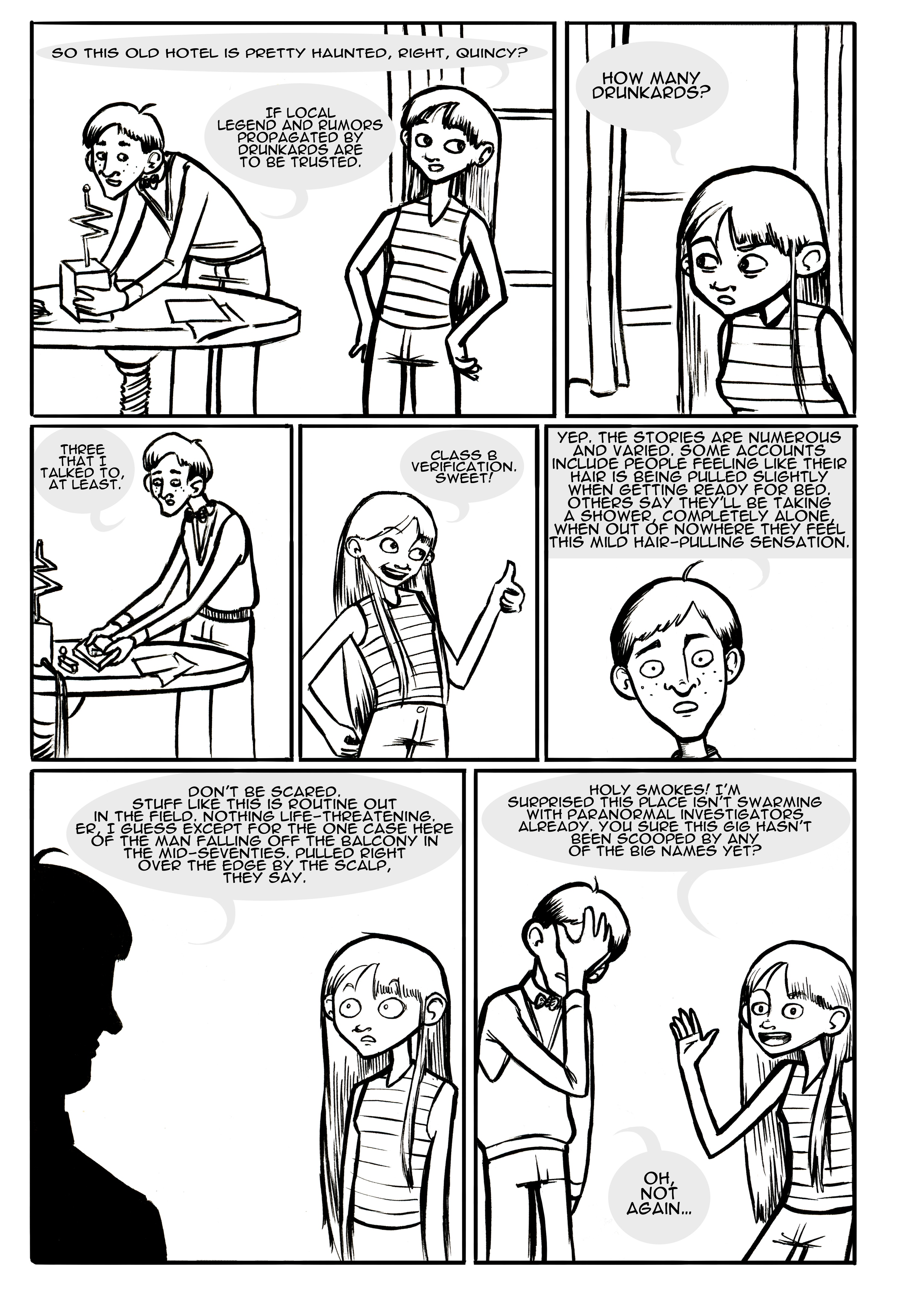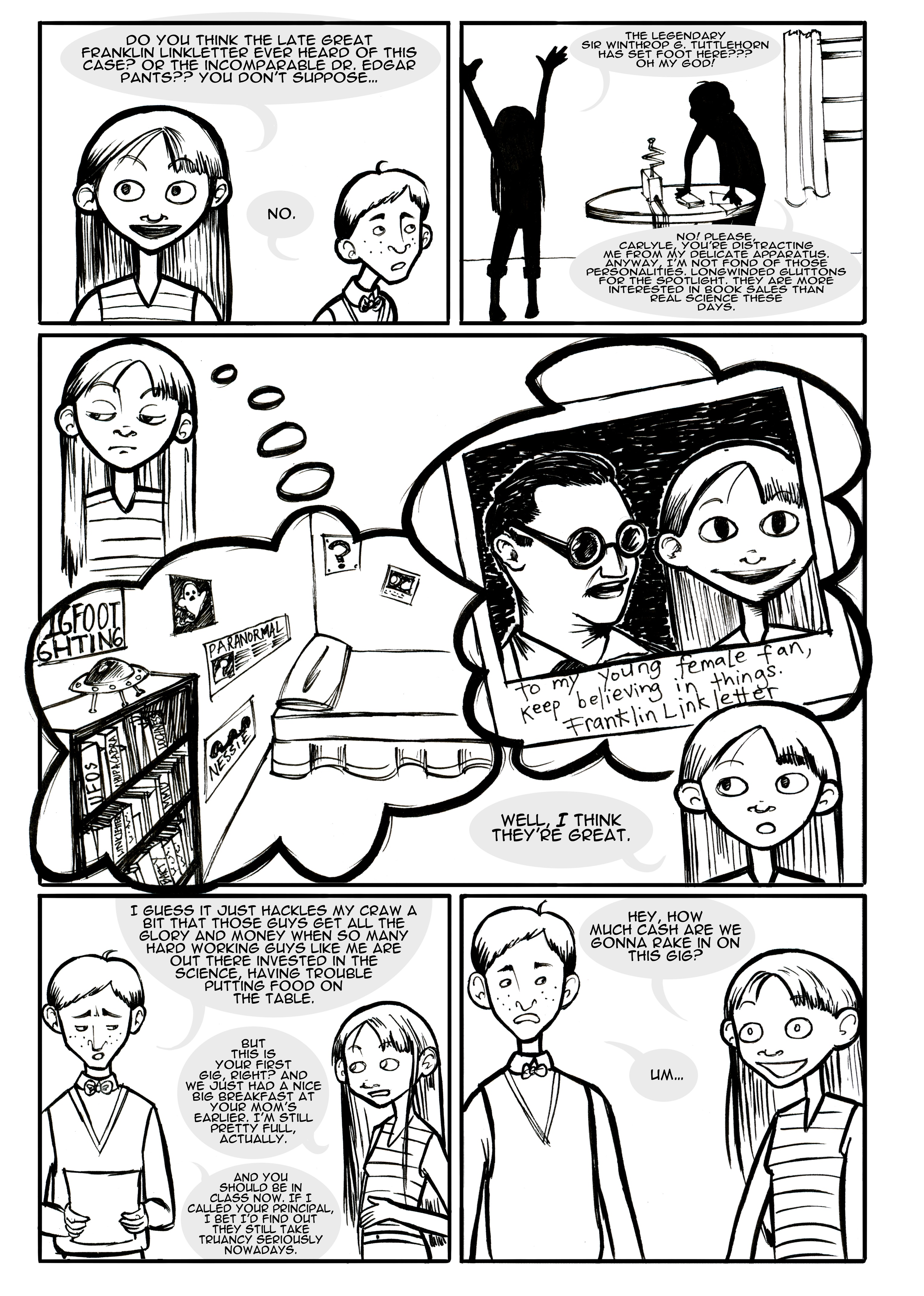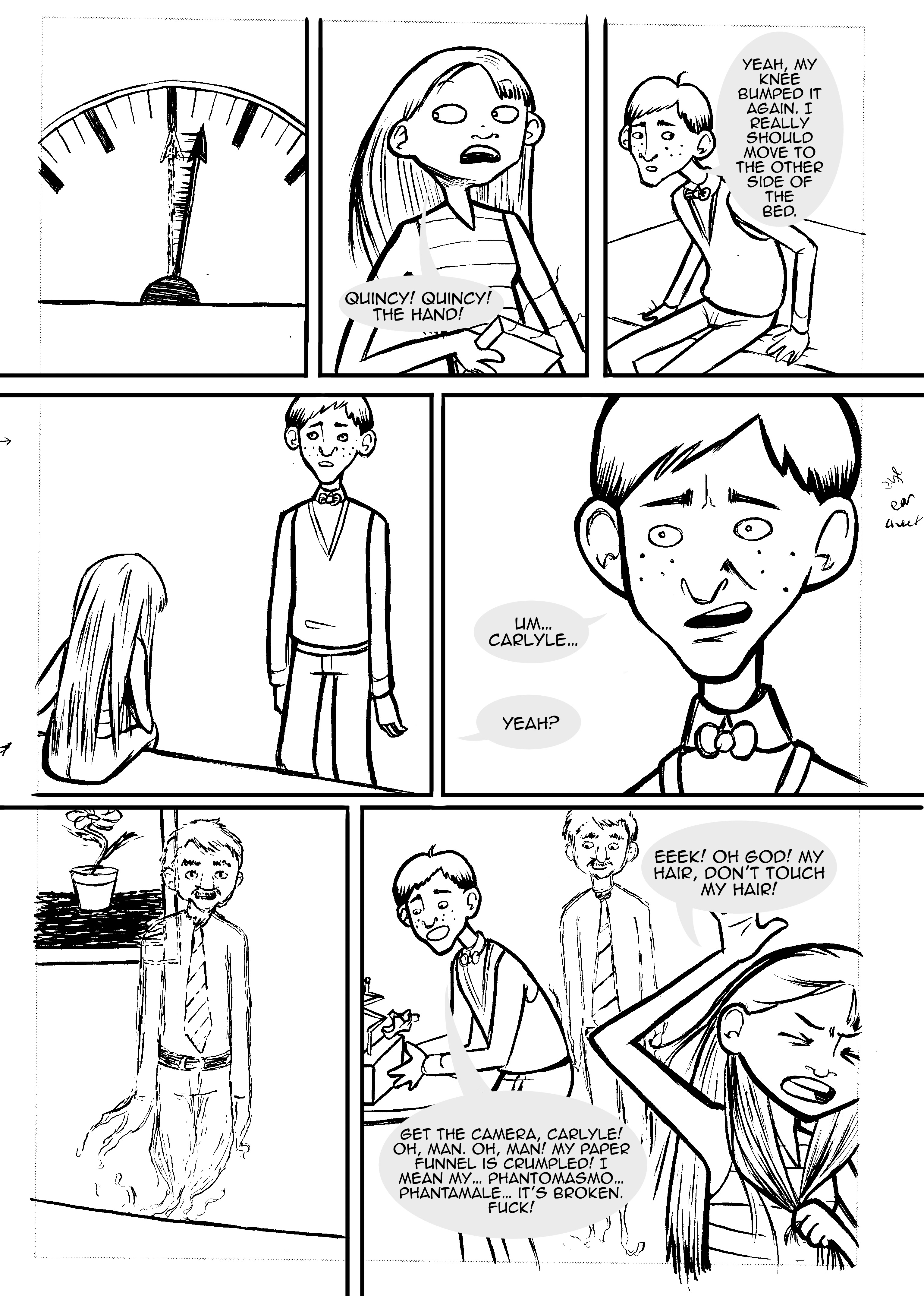 The TSO (Team Special Olympics) Gazette is a physical zine by Andrew Hussie and some of his friends. Though the full contents are currently lost media, a lot of it has been posted in multiple forms: the forward text, some related images, and the script and textless panels for "Quincy & Carlyle's Ectobiology", a comic allegedly written by Hussie and drawn by Betelgeuse (might be the other way around?). Discord user virtuademon/roxie combined the script and panels to turn it into a finished product, which is mirrored below.